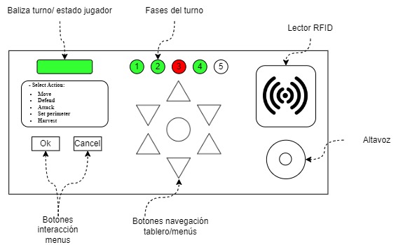 Esta aplicación se encargará de comunicar con el tablero y servir de interfaz entre el jugador y el ‘Director de juego’ virtual. Este director de juego será el código del programa que irá guiando al jugador a las acciones a realizar en las fases de cada turno (mover, defender, atacar, recolectar, minar, comerciar, etc…) y mostrará los resultados de esas acciones. Esto lo hará usando una pequeña pantalla donde mostrará las opciones de cada fase y mostrando en el tablero iluminando las celdas afectadas que rango, dirección u objetivo que afecta a la acción seleccionada. El jugador, además de poder seleccionar la acción a realizar mediante unos botones de selección, de aceptar y cancelar, dispone de un navegador en forma de 6 botones que permiten seleccionar el rango o dirección de esa acción. El interfaz de jugador simplificado sería tal que así: